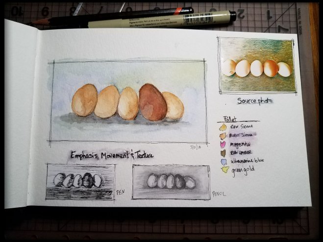 So in my trail journal, I thought I’d start with an idea for my next drawing mini-lesson on Emphasis with Texture and Movement. I want to address and focus on Emphasis and what it means visually. I thought I’d also demonstrate this element by using different media. One thumbnail watercolor painting, a pencil sketch and pen and ink drawing. It would be nice to compare the different mediums side-by-side. Also, I am going to use this photo and put it in the journal as a reference photograph.