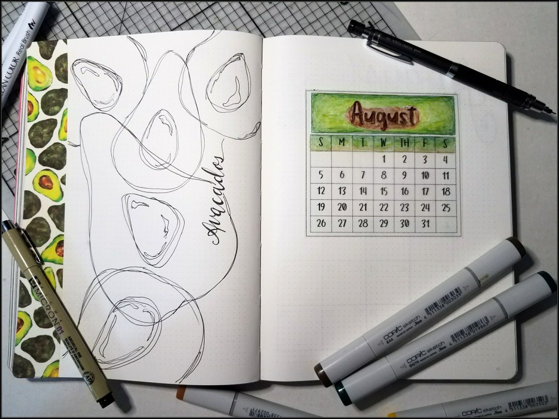 Copic markers are alcohol based markers that are used for graphic design, illustration, and other types of drawing. Like all alcohol based markers, they do not work well with bujo paper, they bleed through the paper and do not blend at all. The same can be said for Sharpie markers. However, I use my Copic markers on vellum paper because they blend beautifully and the color is amazing. On my August calendar, I used Copic markers to fill in color for my avocado theme.