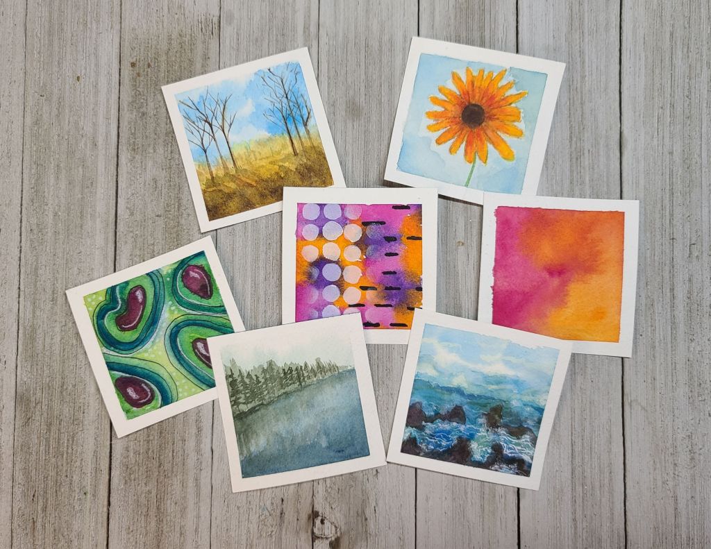 Mini art. Small projects, that do not take a lot of time to complete, yet leave us satisfied. I found that using four inch by four inch paper is a great format. I use different papers, drawing paper, watercolor paper, pastel paper, and Bristol paper. I precut these papers so I can use different mediums. So I’m ready for whatever the mood strikes. And it doesn’t have to be a masterpiece just a small space to doodle, make something abstract, or sketch. It’s like my short lists, something I can accomplish in one day and feel good about myself. I’ve seen You Tube shorts and TikTok videos of artists making mini art. Some are making tiny art using one by two and a half inch paper. There are 100 tiny paintings in a year challenges, and making travel art kits, that give me inspiration. For me, I’m not ready to make that kind of commitment, but taking baby steps is a start. It’s all about what you are comfortable with.